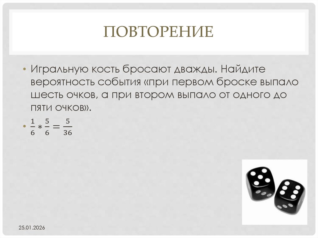 ПОВТОРЕНИЕ• Игральную кость бросают дважды. Найдите