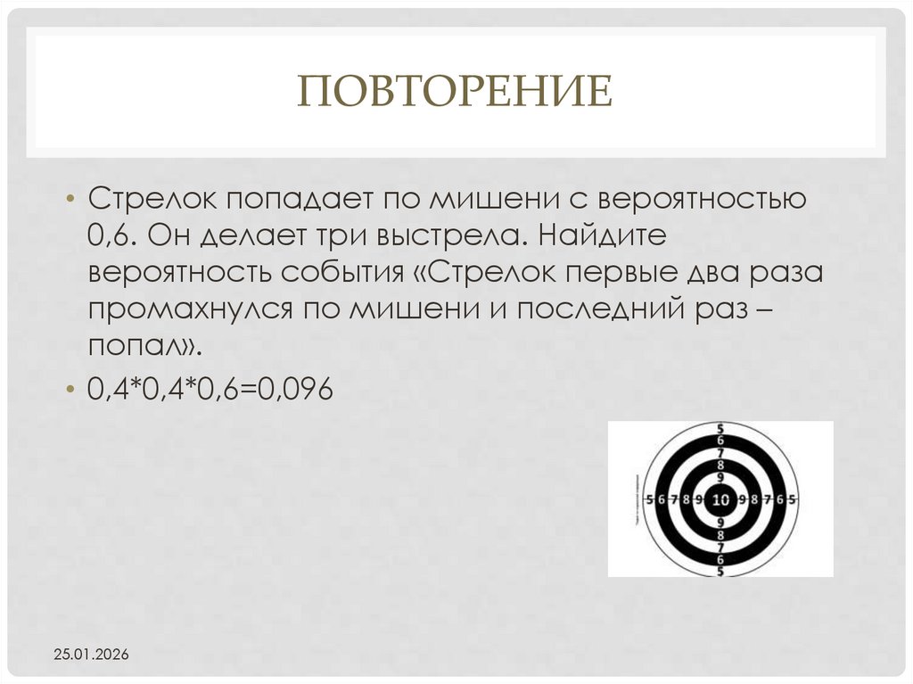 ПОВТОРЕНИЕ• Стрелок попадает по мишени с вероятностью