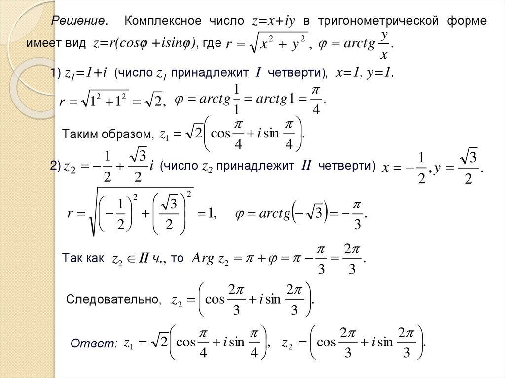 Решение.Комплексное число z=x+iy в тригонометрической форме