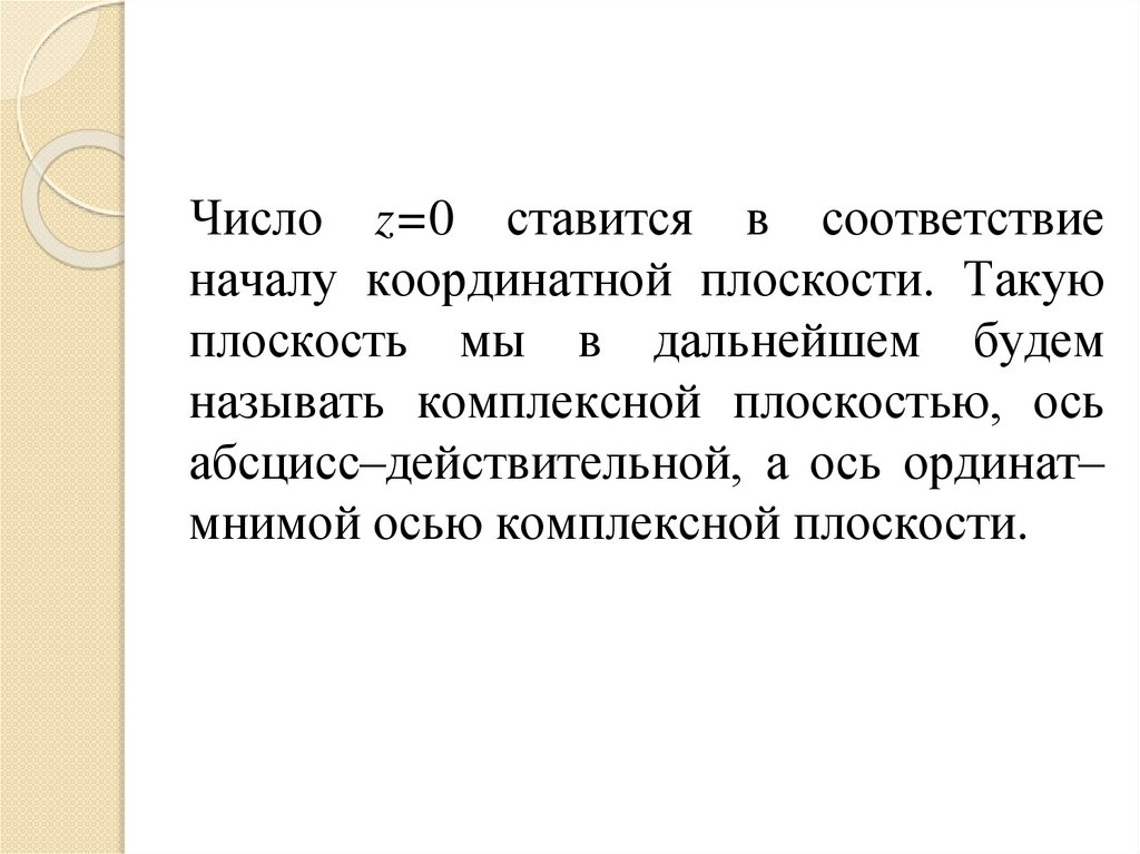 Число z=0 ставится в соответствиеначалу координатной плоскости. Такую