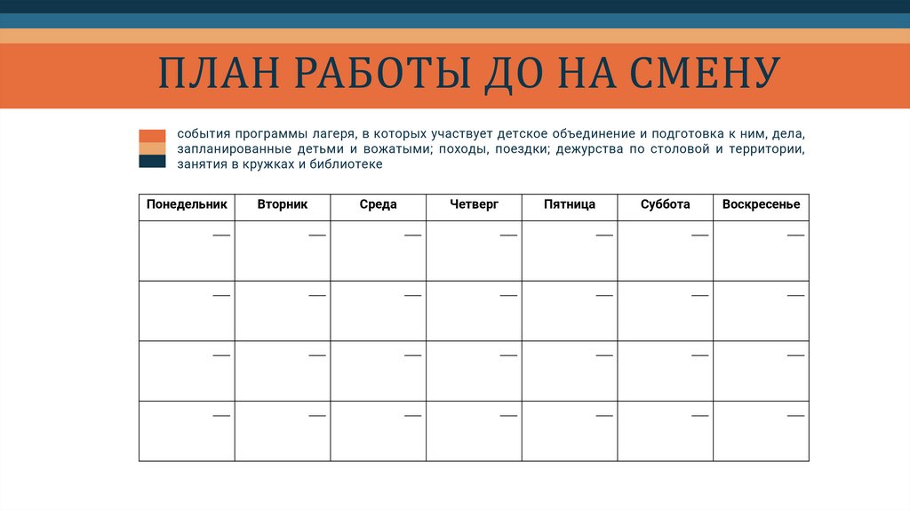 запланированные детьми и вожатыми; походы, поездки; дежурства по столовой и территории,