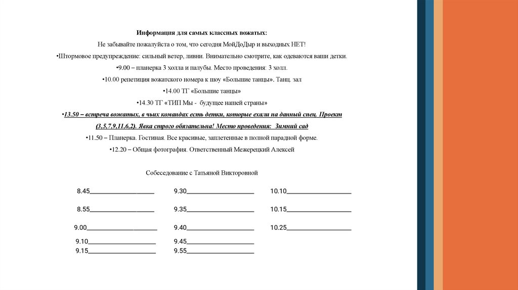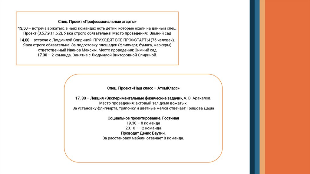 •13.50 – встреча вожатых, в чьих командах есть детки, которые ехали на данный спец. Проект