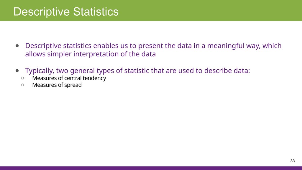 Descriptive Statistics● Descriptive statistics enables us to present the data in a meaningful way, which