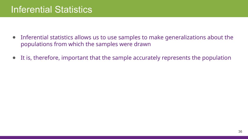 Inferential Statistics● Inferential statistics allows us to use samples to make generalizations about the