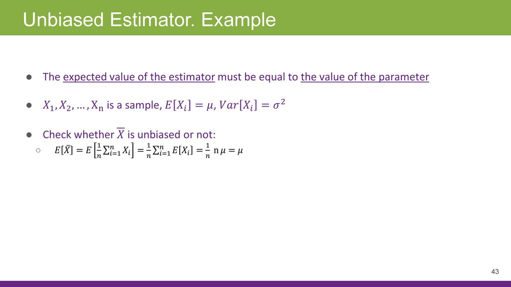unbiased: the expected value of the estimator must be equal to the value of the parameter