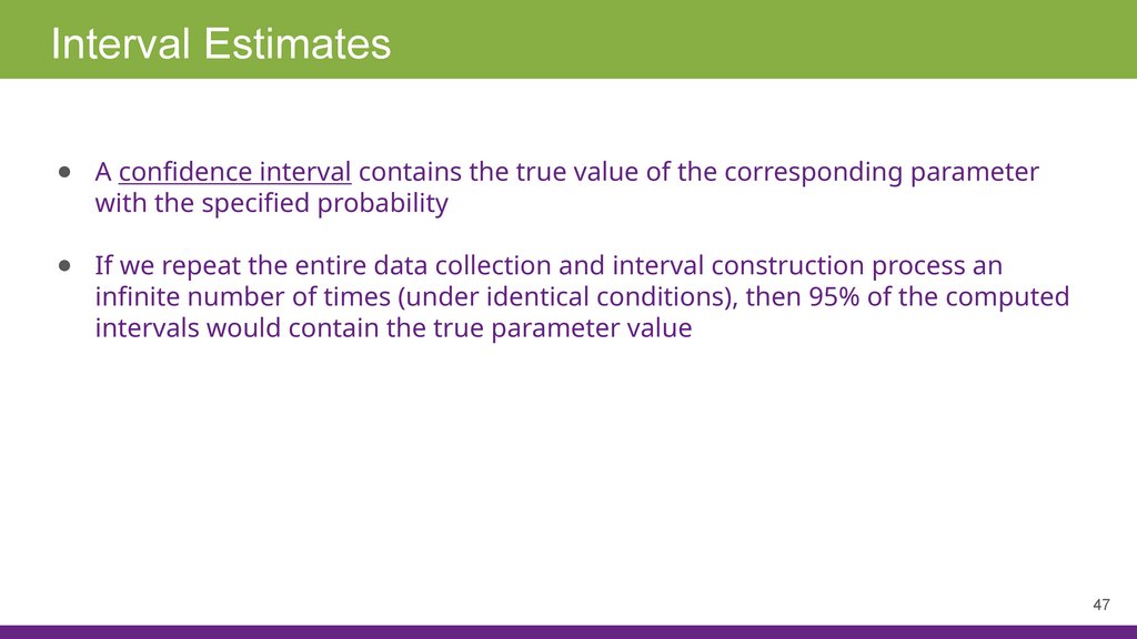 Interval Estimates● A confidence interval contains the true value of the corresponding parameter