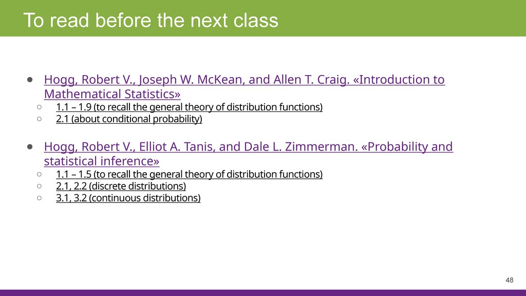 To read before the next class● Hogg, Robert V., Joseph W. McKean, and Allen T. Craig. «Introduction to