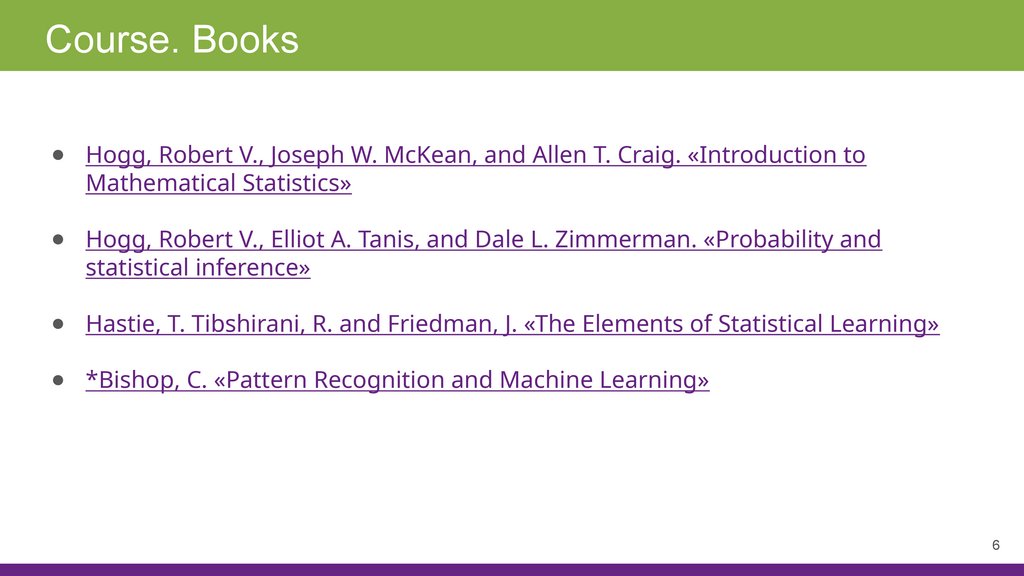 Course. Books● Hogg, Robert V., Joseph W. McKean, and Allen T. Craig. «Introduction to