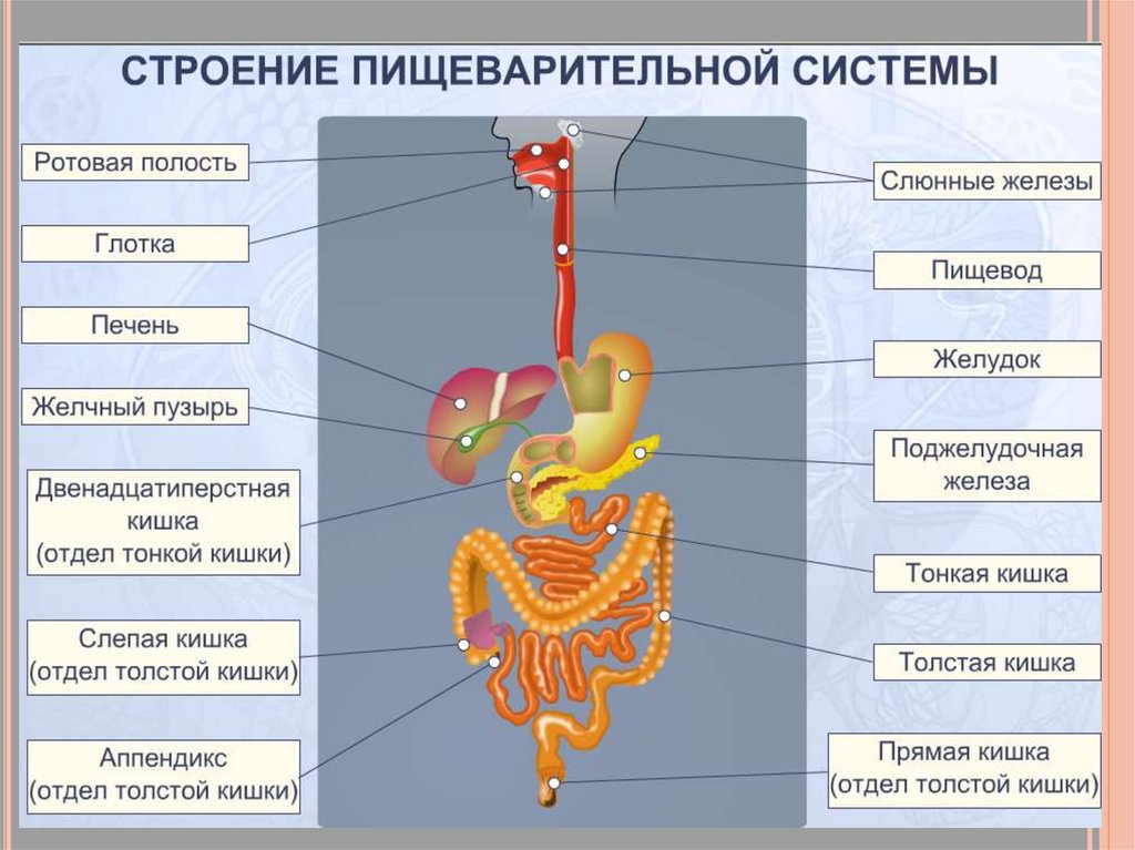 желудок, тонкий и толстый кишечник.