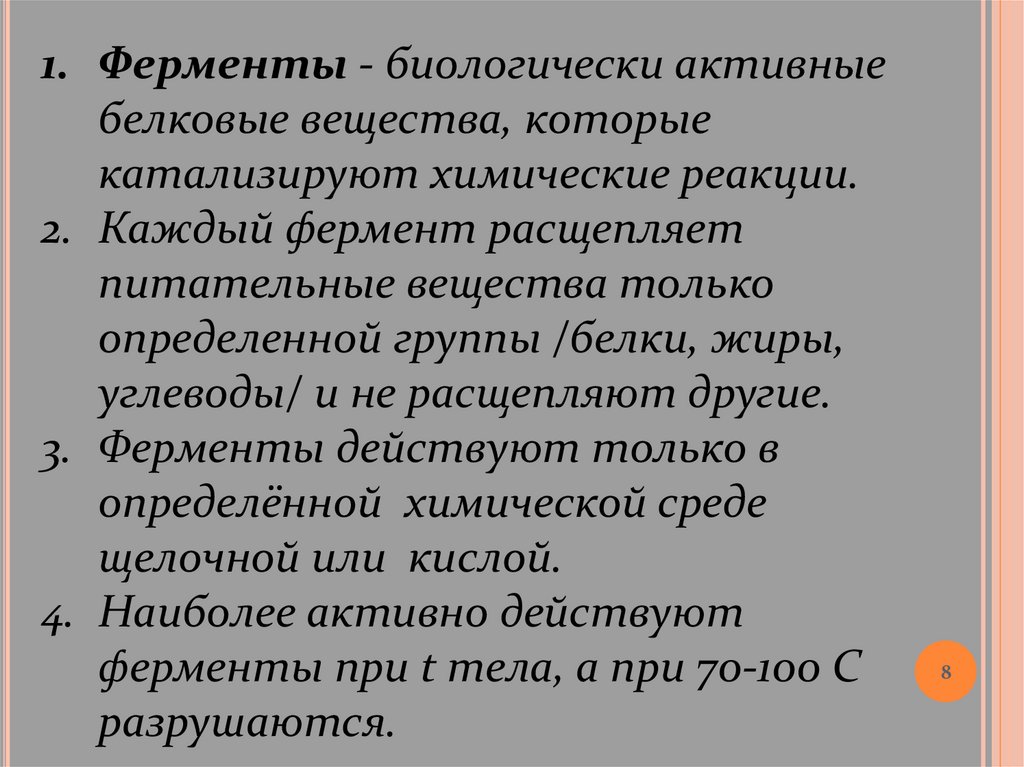 1. Ферменты - биологически активныебелковые вещества, которые