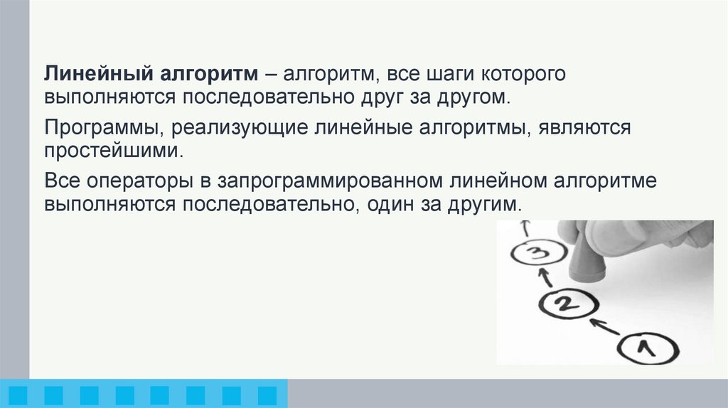 Линейный алгоритм – алгоритм, все шаги котороговыполняются последовательно друг за другом.