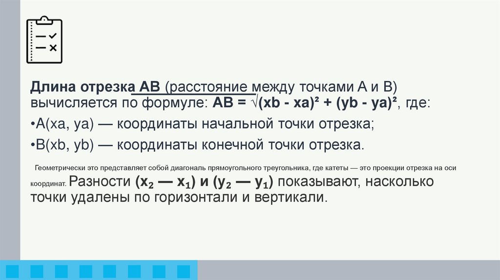 Длина отрезка AB (расстояние между точками A и B)вычисляется по формуле: AB = √(xb - xa)² + (yb - ya)², где: