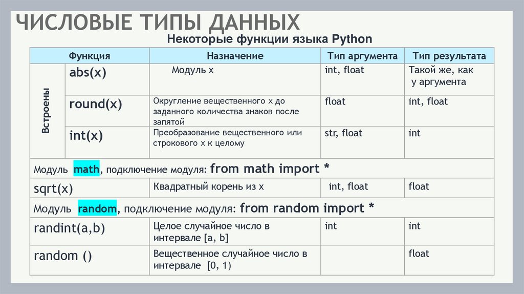ЧИСЛОВЫЕ ТИПЫ ДАННЫХНекоторые функции языка Python