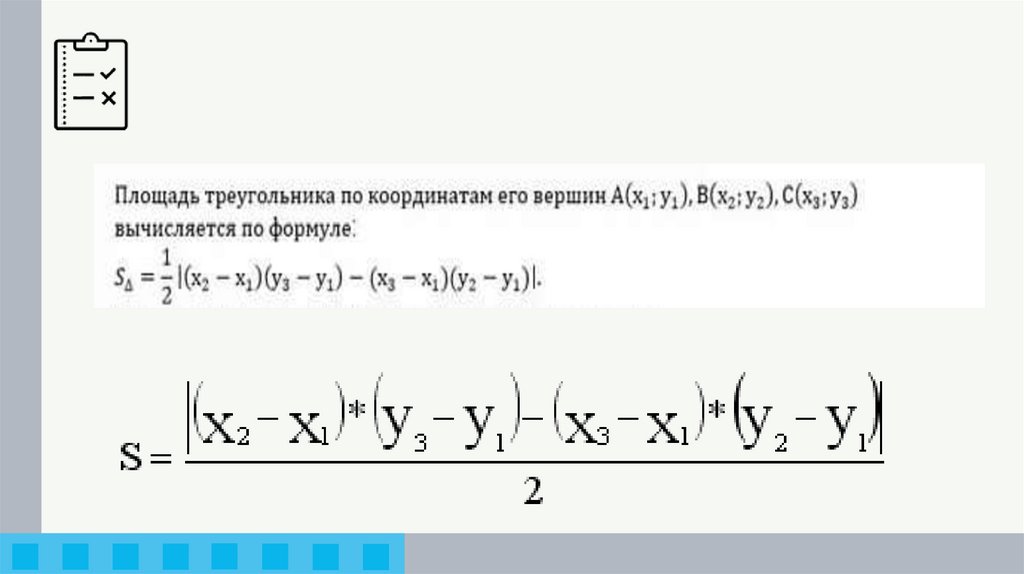 Известны координаты вершин A, B, C треугольника.Напишите программу, вычисляющую площадь этого треугольника.