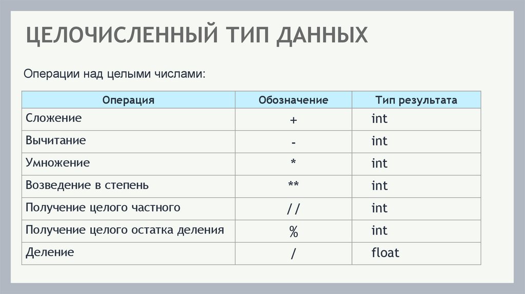 ЦЕЛОЧИСЛЕННЫЙ ТИП ДАННЫХОперации над целыми числами: