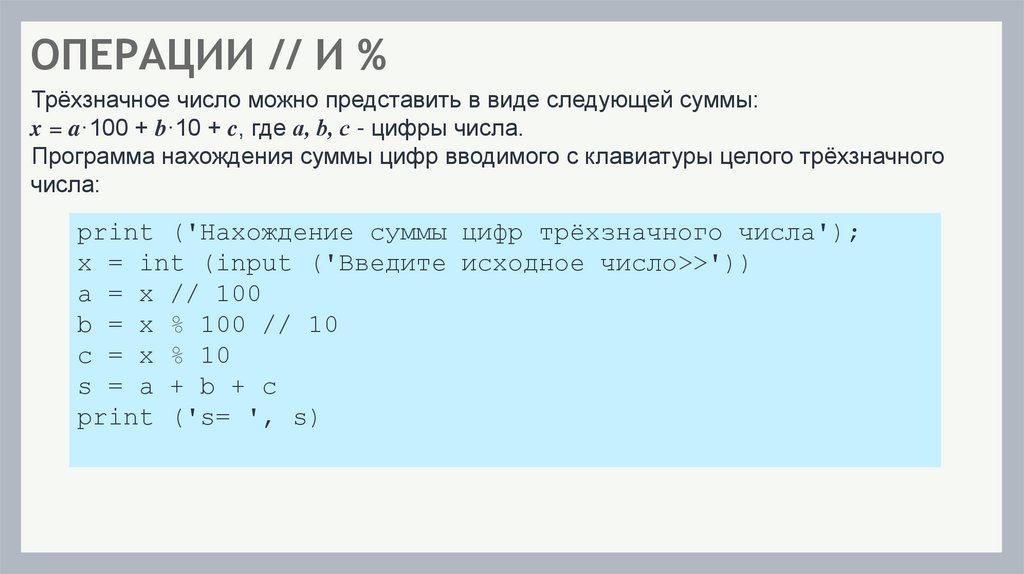 ОПЕРАЦИИ // И %Трёхзначное число можно представить в виде следующей суммы:
