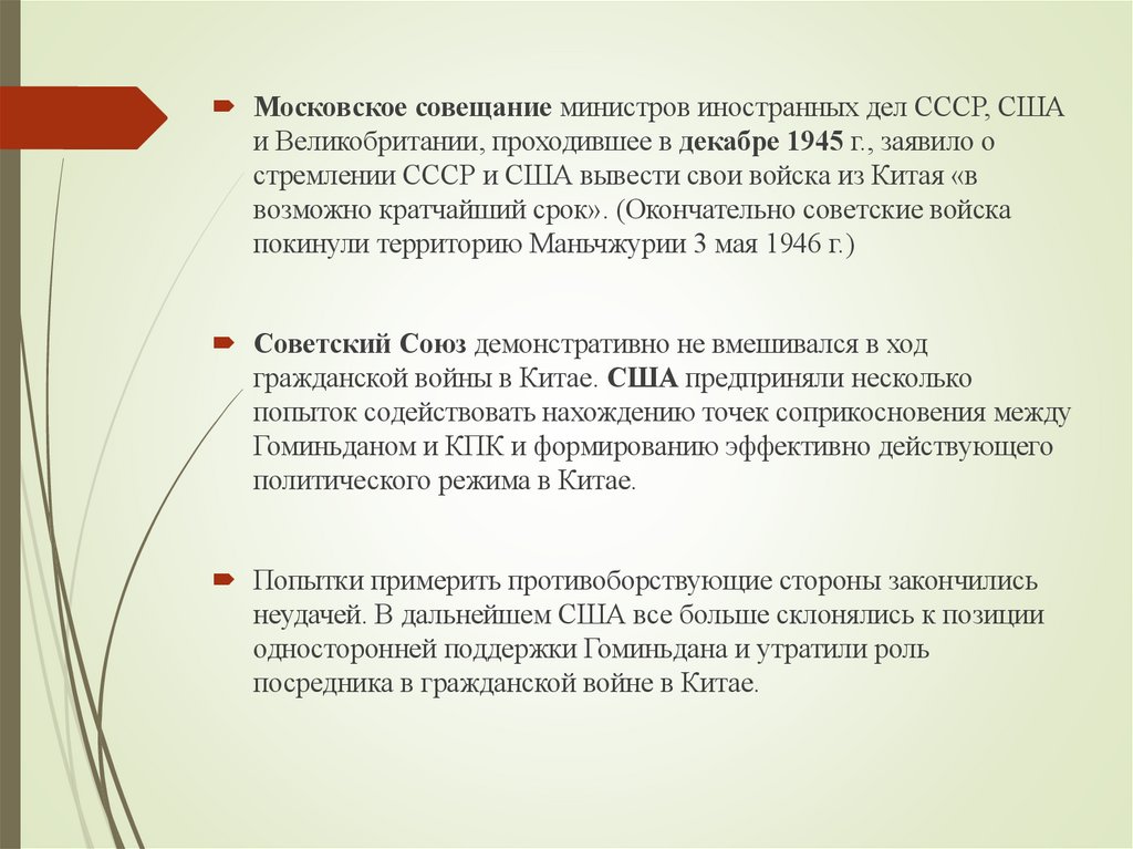 Московское совещание министров иностранных дел СССР, СШАи Великобритании, проходившее в декабре 1945 г., заявило о
