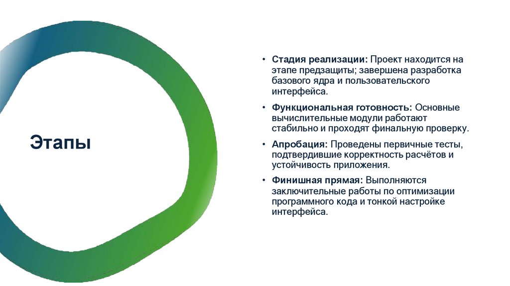 • Стадия реализации: Проект находится наэтапе предзащиты; завершена разработка