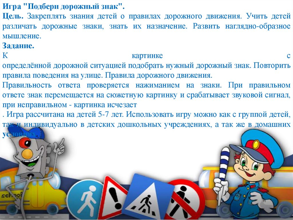 Игра "Подбери дорожный знак".Цель. Закреплять знания детей о правилах дорожного движения. Учить детей
