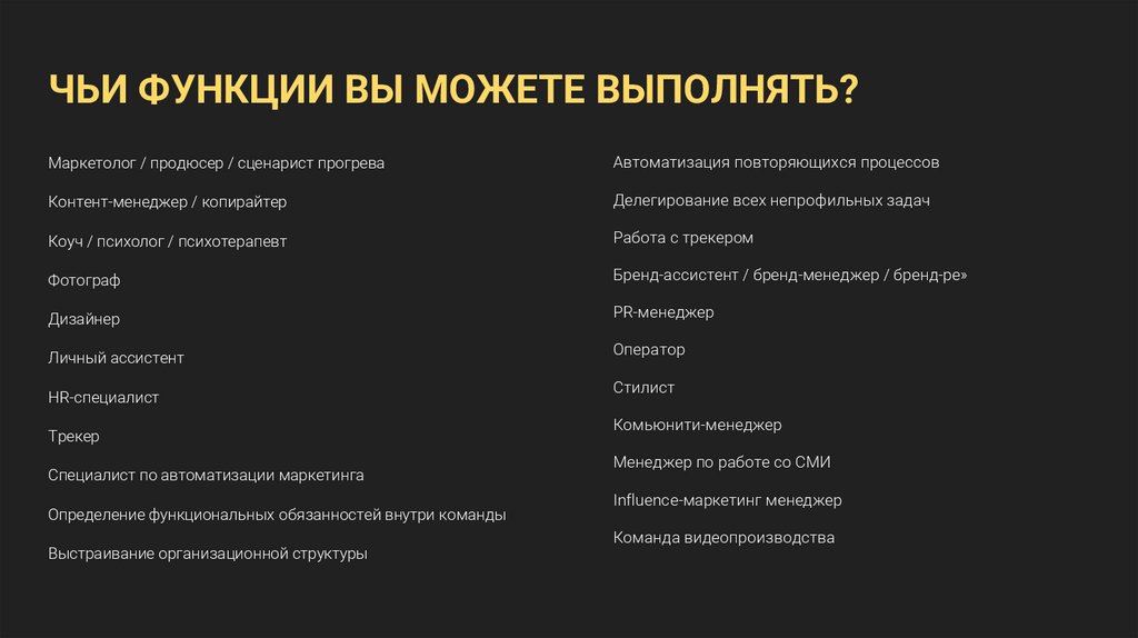 ЧЬИ ФУНКЦИИ ВЫ МОЖЕТЕ ВЫПОЛНЯТЬ?Маркетолог / продюсер / сценарист прогрева