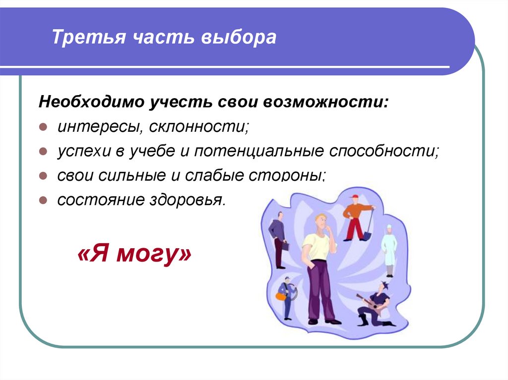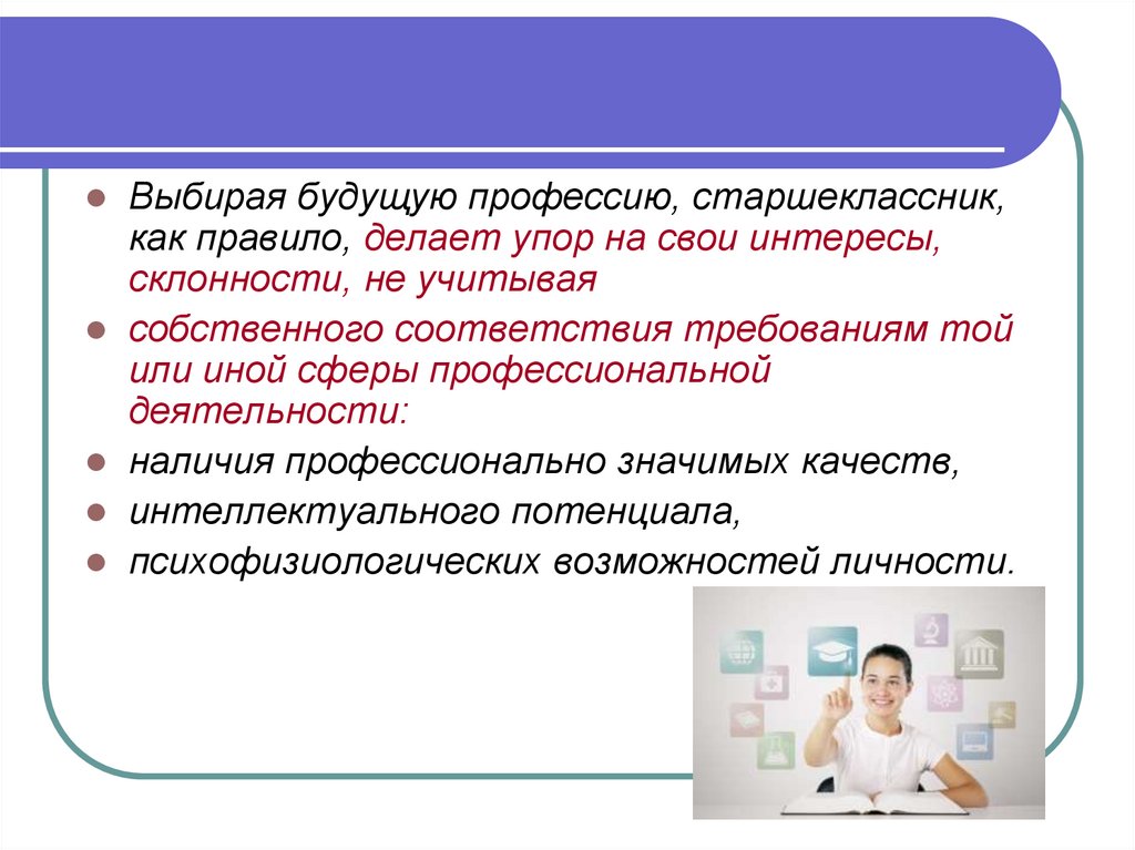 Выбирая будущую профессию, старшеклассник,как правило, делает упор на свои интересы,