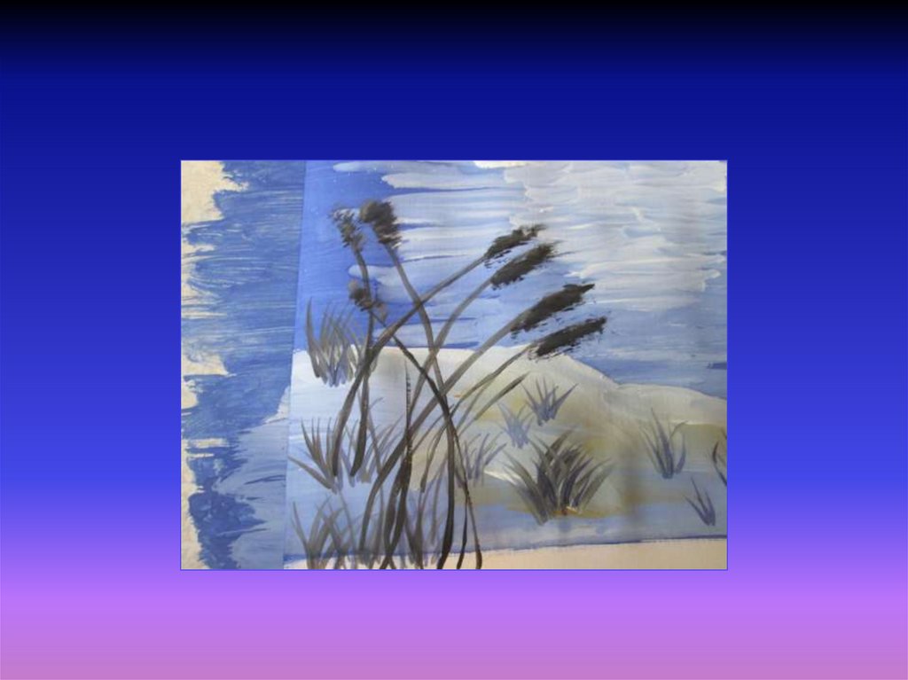 27. Чёрной краской тонкой кисточкой сначала прорисовываем стебли камыша. Затем тонкой кисточкой (щетина) рисуем метёлочки камыша.