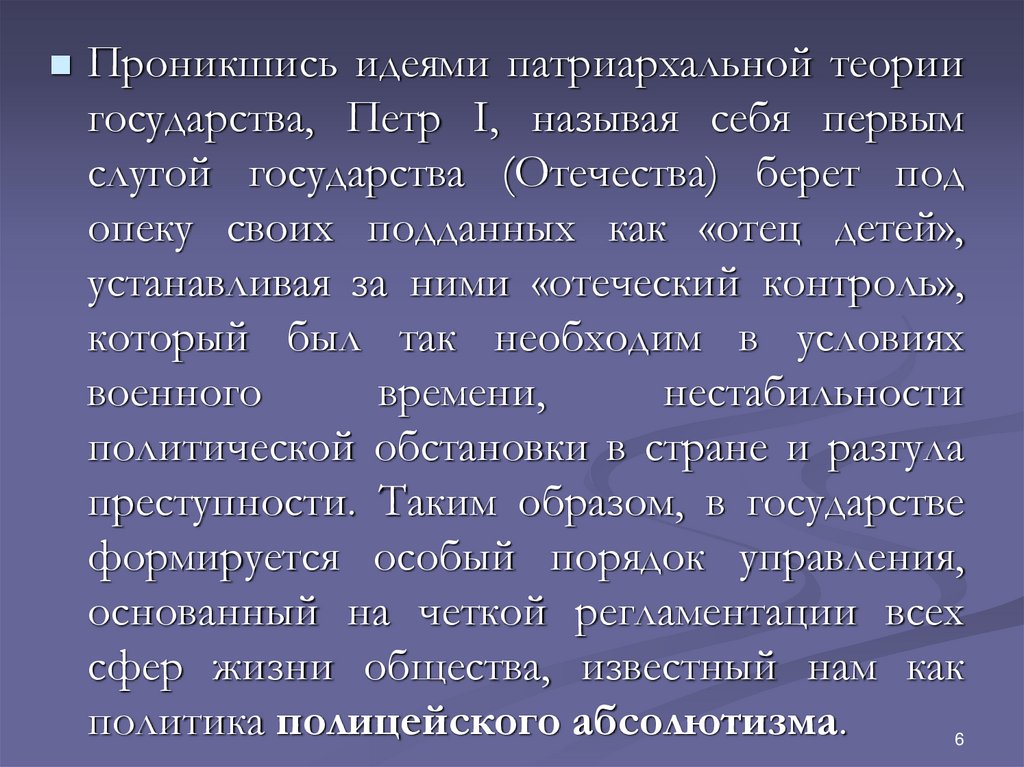 Проникшись идеями патриархальной теориигосударства, Петр I, называя себя первым