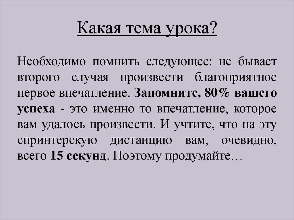первое впечатление. Запомните, 80% вашего
