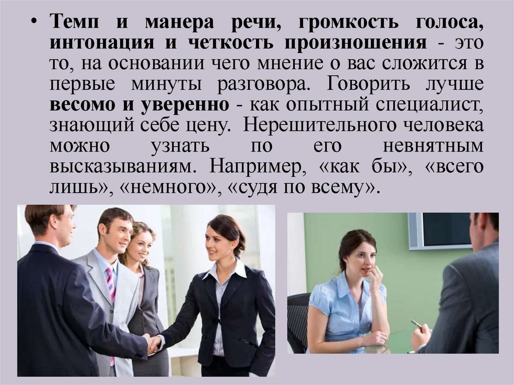 • Темп и манера речи, громкость голоса,интонация и четкость произношения - это