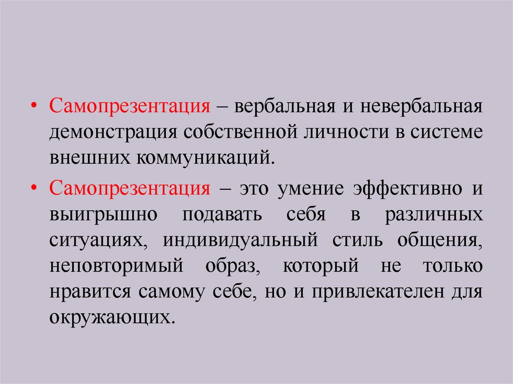 • Самопрезентация – вербальная и невербальнаядемонстрация собственной личности в системе