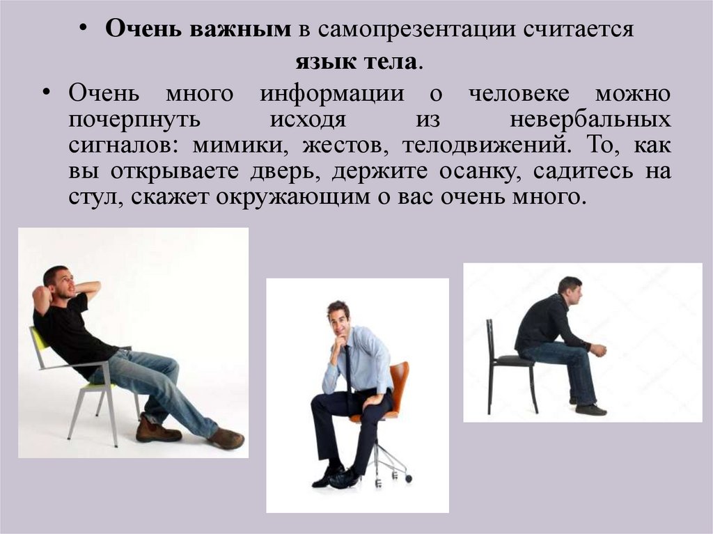• Очень важным в самопрезентации считаетсяязык тела.