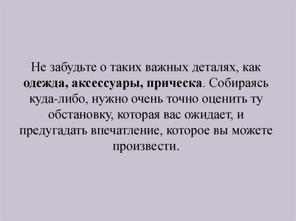 Не забудьте о таких важных деталях, какодежда, аксессуары, прическа. Собираясь