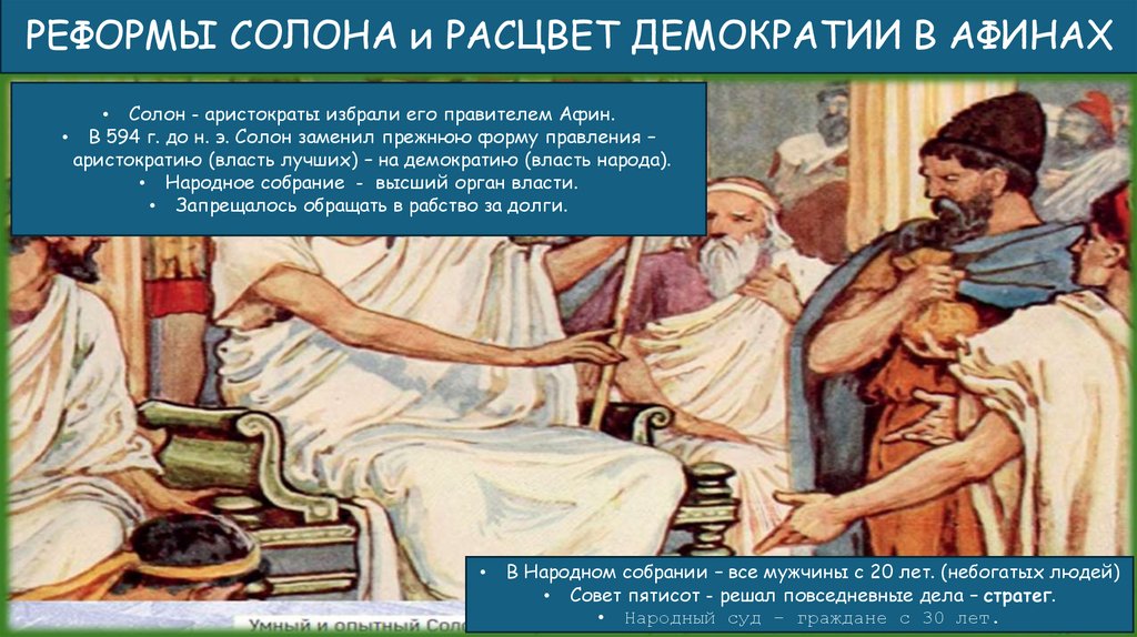 РЕФОРМЫ СОЛОНА и РАСЦВЕТ ДЕМОКРАТИИ В АФИНАХ• Солон - аристократы избрали его правителем Афин.