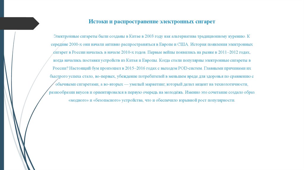обычными сигаретами, а во-вторых — умелый маркетинг, который делал акцент на технологичности,