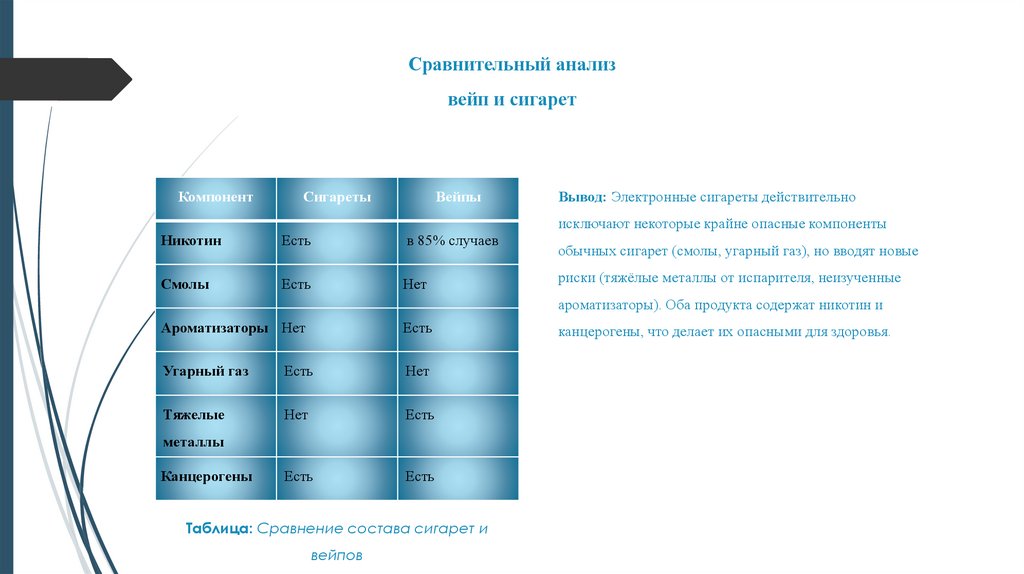 обычных сигарет (смолы, угарный газ), но вводят новые