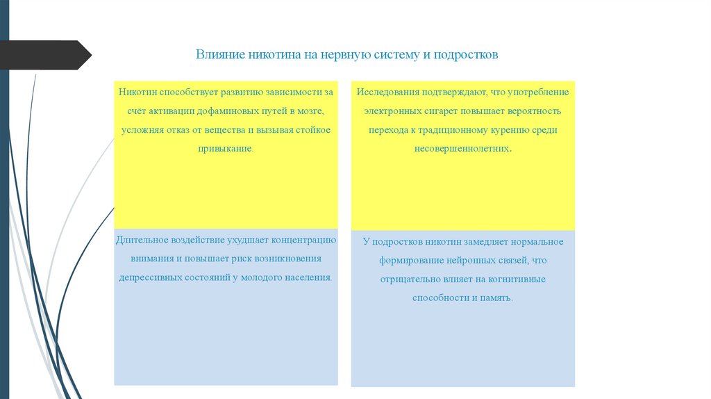 Влияние никотина на нервную систему и подростковНикотин способствует развитию зависимости за