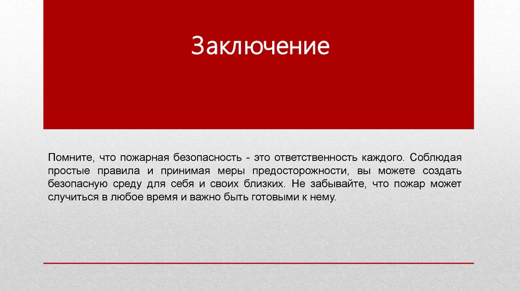 ЗаключениеПомните, что пожарная безопасность - это ответственность каждого. Соблюдая