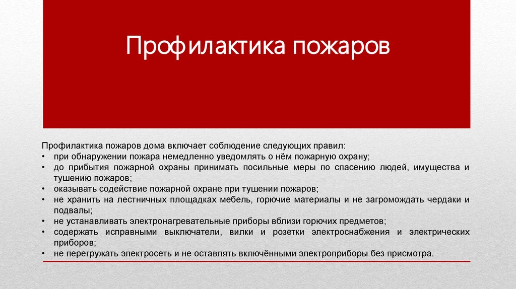Профилактика пожаровПрофилактика пожаров дома включает соблюдение следующих правил: