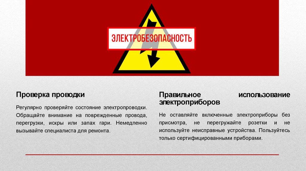 1. Следите за исправностью электроприборов и проводки.