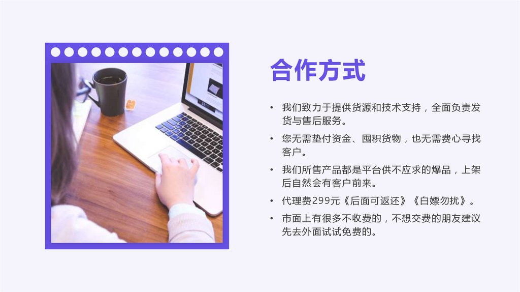 合作方式• 我们致力于提供货源和技术支持 全面负责发