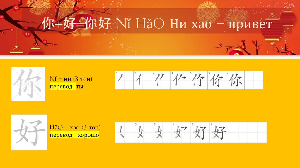 你+好=你好 Nǐ hǎo Ни хао – приветNǐ – ни (3 тон)