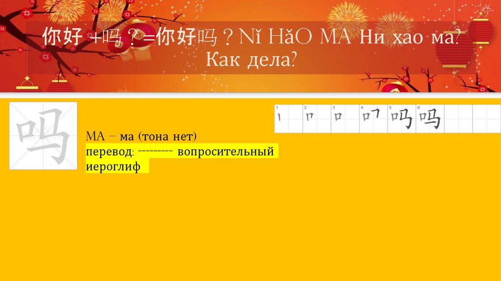 你好 +吗 =你好吗 Nǐ hǎo ma Ни хао ма?Как дела?