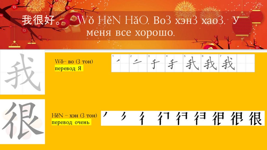 我很好。 - Wǒ hěn hǎo. Во3 хэн3 хао3. Уменя все хорошо.