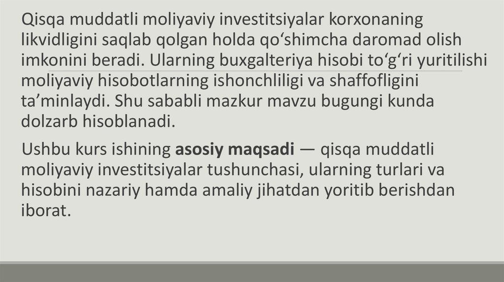 Qisqa muddatli moliyaviy investitsiyalar:korxonaning moliyaviy barqarorligini oshiradi;