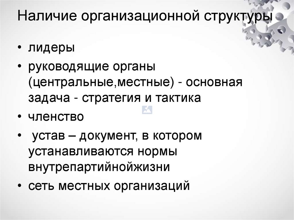Наличие организационной структуры• лидеры