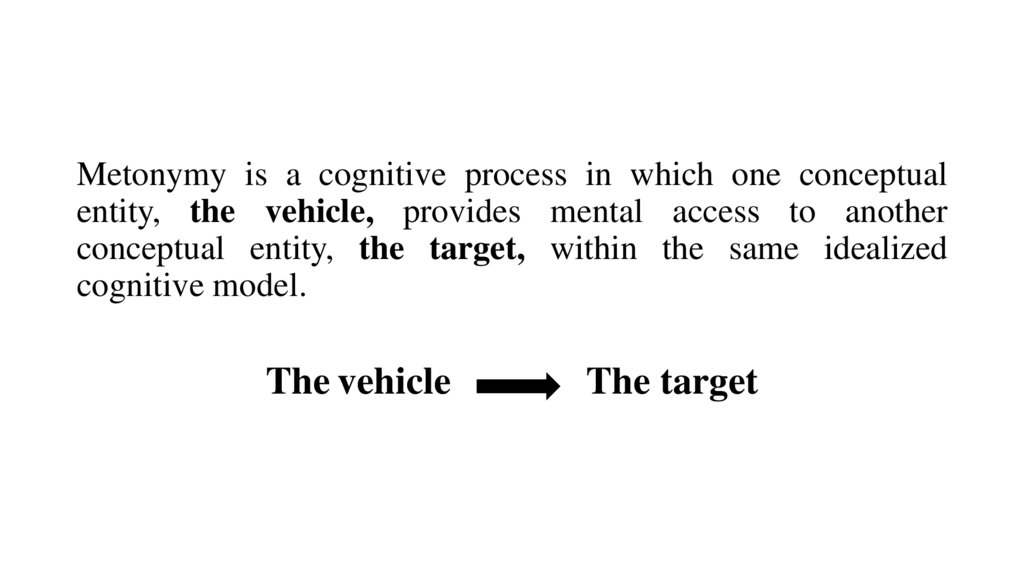 Metonymy is a cognitive process in which one conceptualentity, the vehicle, provides mental access to another