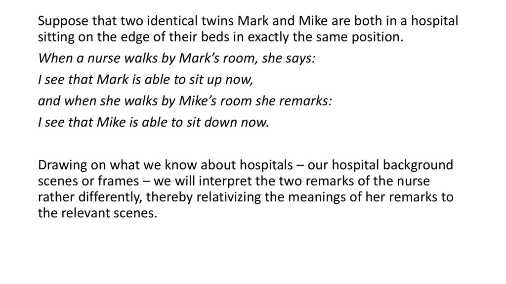 Suppose that two identical twins Mark and Mike are both in a hospitalsitting on the edge of their beds in exactly the same position.