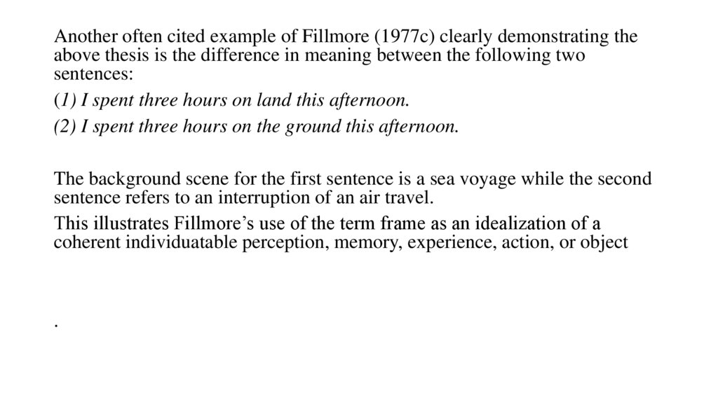 Another often cited example of Fillmore (1977c) clearly demonstrating theabove thesis is the difference in meaning between the following two