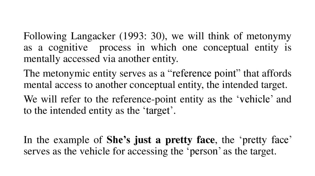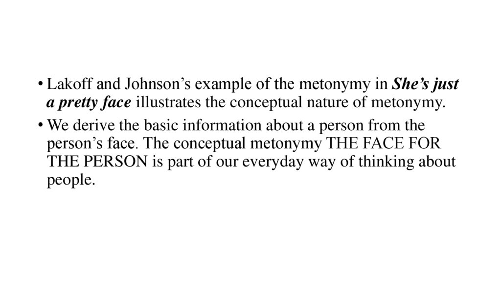 • Lakoff and Johnson’s example of the metonymy in She’s justa pretty face illustrates the conceptual nature of metonymy.