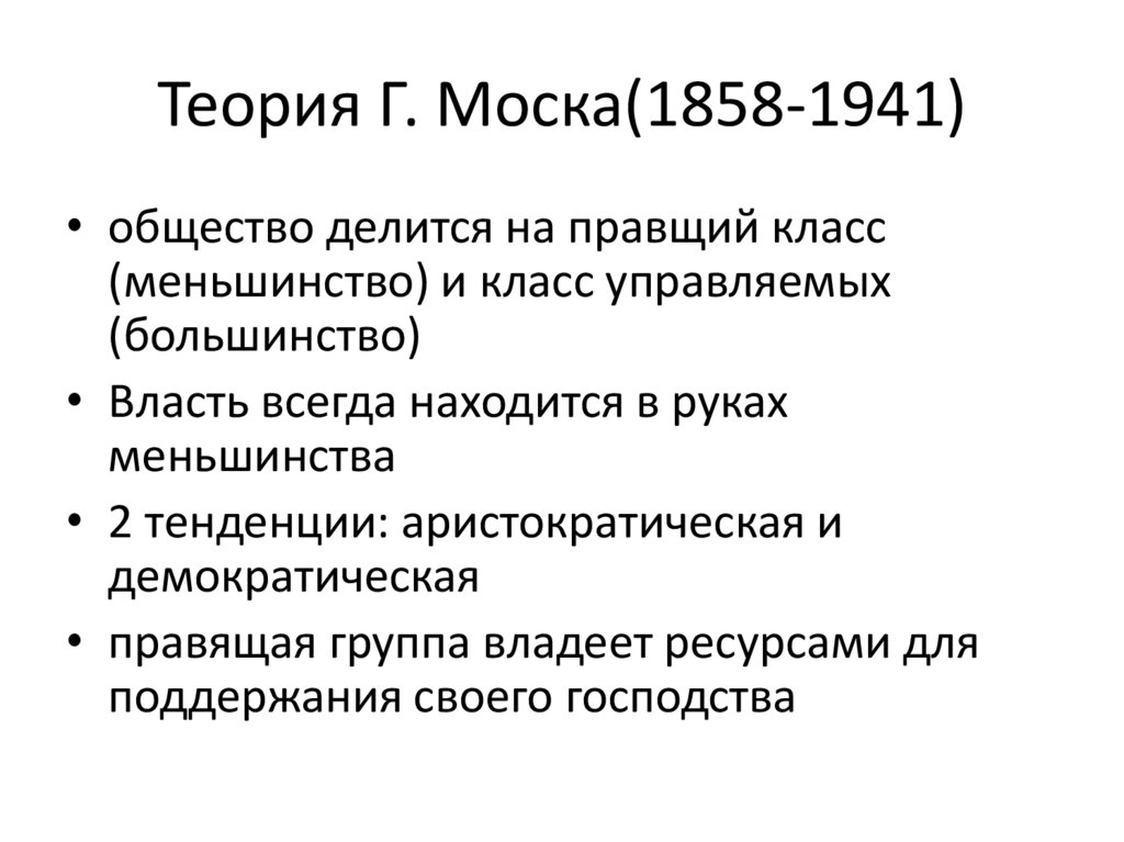 Теория Г. Моска(1858-1941)• общество делится на правщий класс